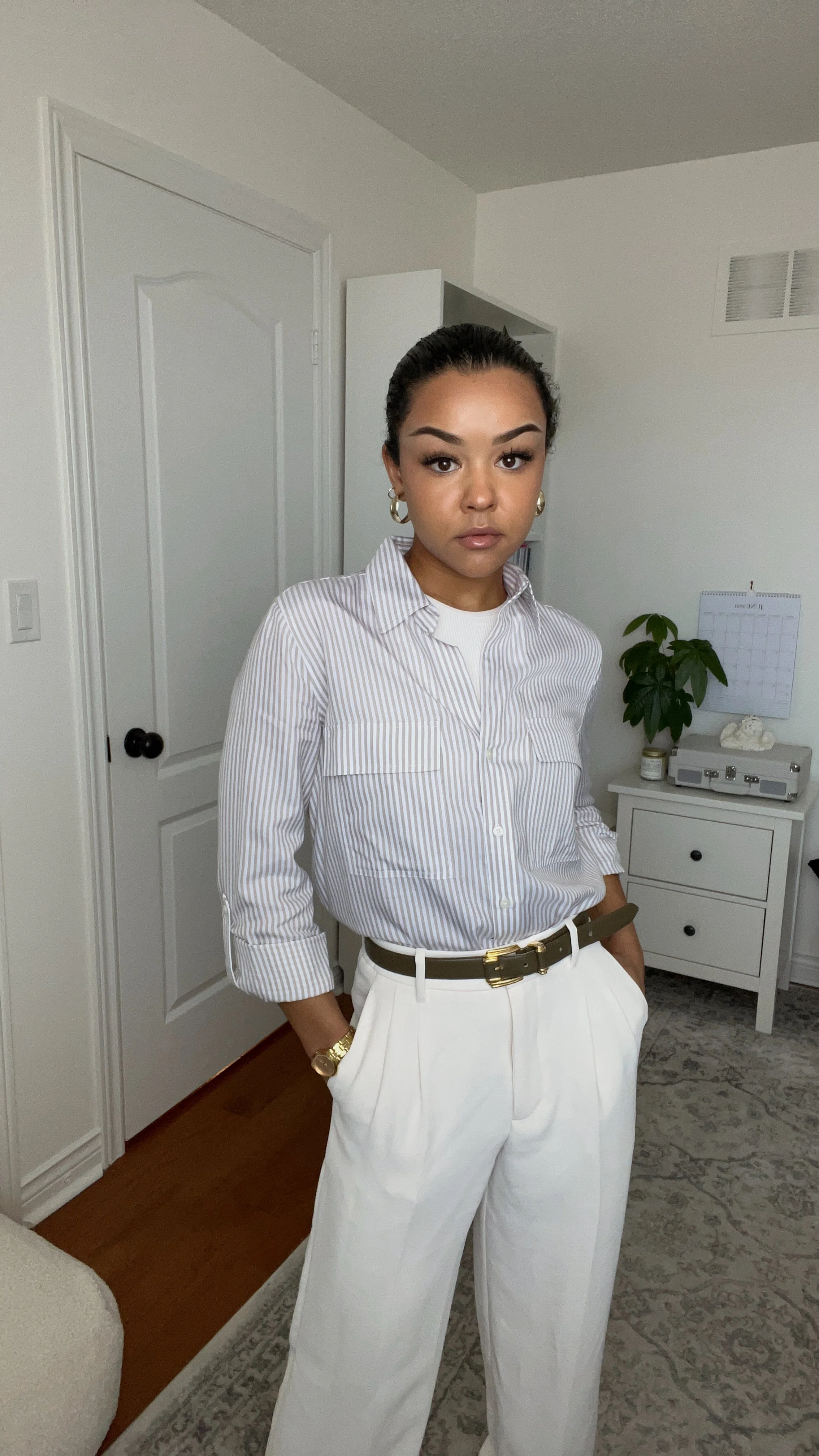 I’m wearing the Utility Shirt in Litzy Stp Wt/Fluent with the The Effortless Pant™ in Light Birch, the Contour Crew Shortsleeve Bodysuit in White underneath, a belt thrifted from my Nana’s closet, and Matt & Nat Marci Women’s Vegan Leather Sneakers.